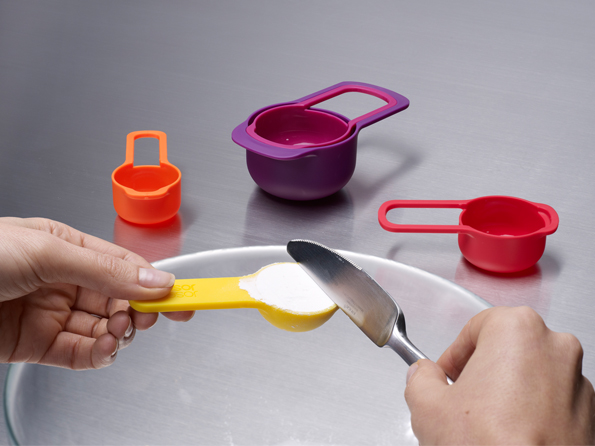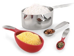 Para medir harina o azúcar en polvo, hay que cernirlas siempre antes de medir, échela en la taza de medir, sin golpear ni sacudirla. Pase luego una espátula por la superficie para obtener una medida rasa. Las tazas de medir sólidos, permiten pasar la espátula o rasero sobre la superficie, para que la medida sea exacta.